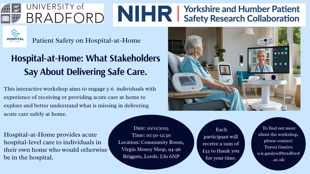 My name is Toyosi Ganiyu. I am a community matron at Bradford District Care NHS Foundation Trust, a PhD student at the University of Bradford, and a member of the Yorkshire and Humber Patient Safety Research Collaboration (YH PSRC). I invite you to take part in this workshop, where you can share your views and experiences of receiving acute hospital care at home.