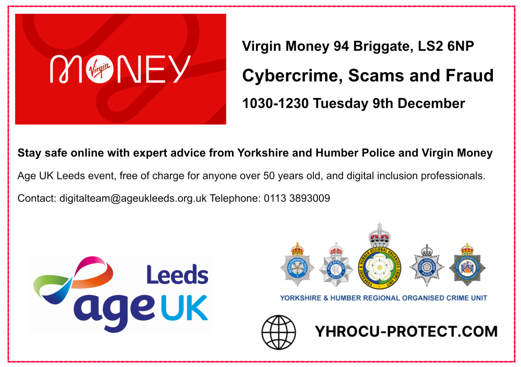 Age UK Leeds, West Yorkshire Police and Virgin Money are teaming up to deliver a talk on online safety on Tuesday, 9 December, at Virgin Money, located on Leeds Briggate.
