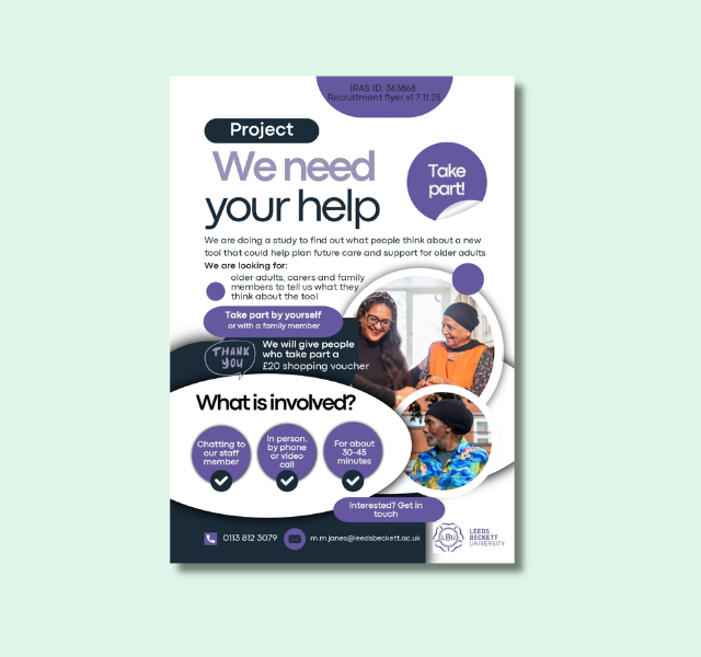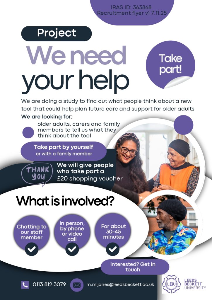 Dr Marie Janes, research fellow for the Centre for Dementia Research at Leeds Beckett University, has a new research project on ‘Risk Prediction models’ and how older people (and their supporters) feel about planning ahead for their social care needs. There is a £20 thank-you voucher for individuals who take part.