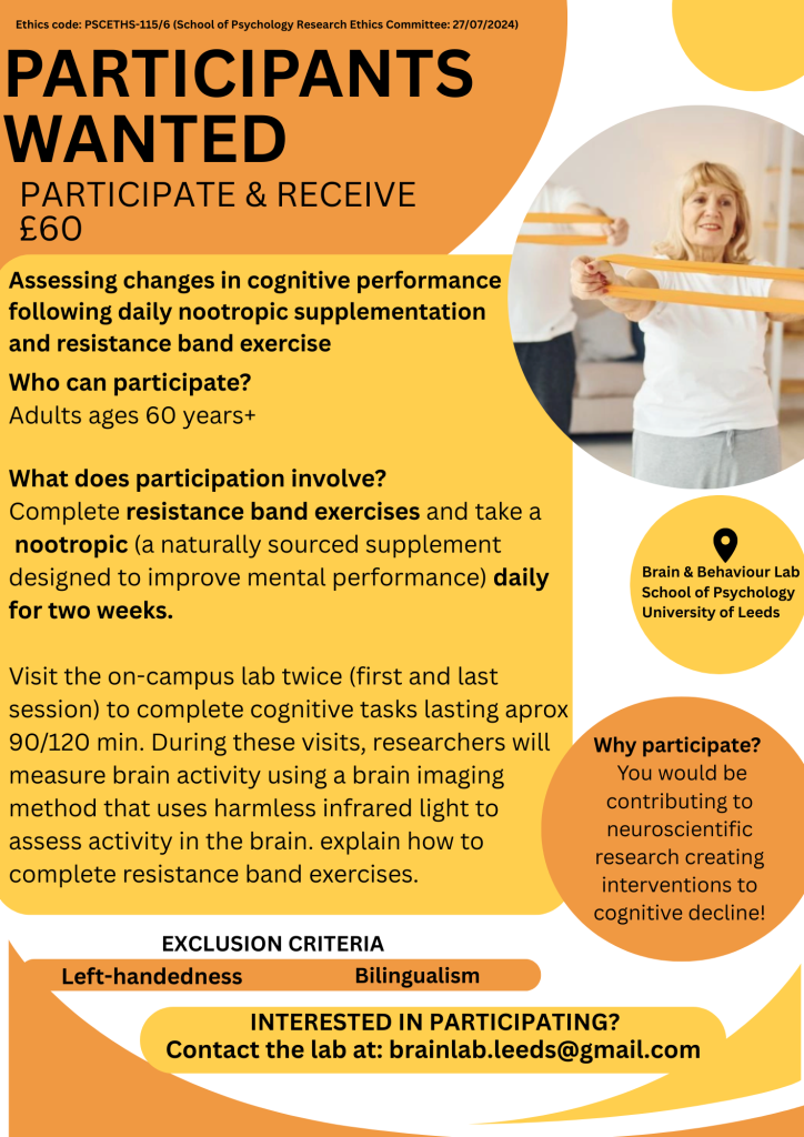 Take part in a friendly research study exploring how gentle resistance-band exercise and a naturally sourced supplement may support thinking and memory in later life. Adults aged 60+ are invited to join a short, two-week programme with guided activities and simple cognitive tasks. You will need to come into the University of Leeds on 2 occasions at the beginning and end of the two weeks of exercise and supplement. Your participation will help advance research aimed at promoting lifelong brain health.