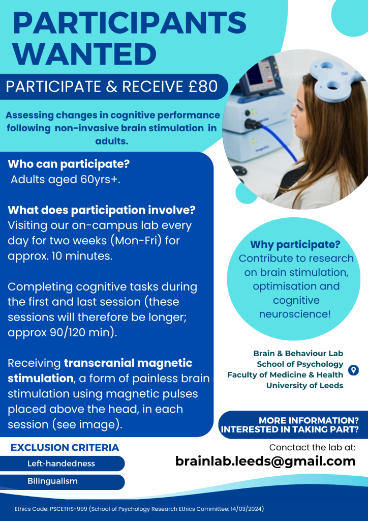 Join an exciting research study investigating how safe, painless brain stimulation may influence thinking skills in adults aged 60 and over. Participation involves short daily visits to the University of Leeds over two weeks, with longer sessions at the beginning and end to complete interactive cognitive tasks. By taking part, you will contribute to important research focused on optimising brain health and wellbeing as we age.