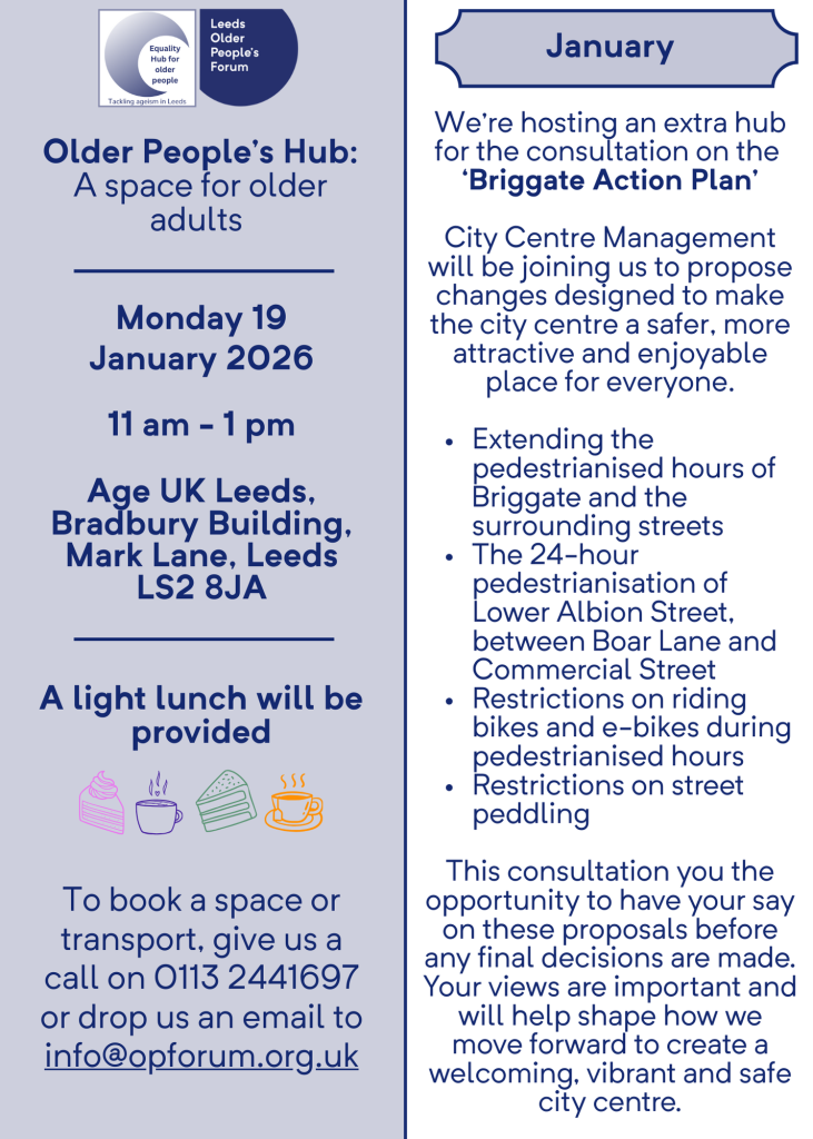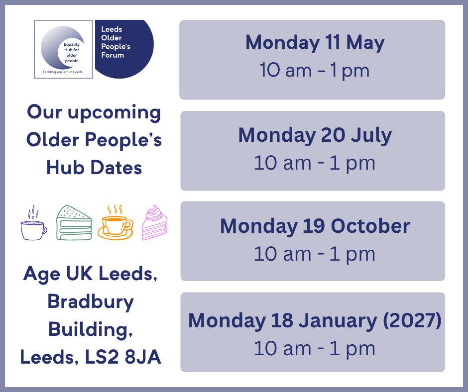 Leeds Older People’s Forum hosts the Older People’s Hub, one of the equality hubs that helps ensure Leeds City Council engages with and involves the full range of citizens who live in Leeds in its decisions.